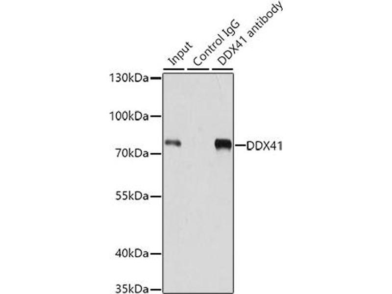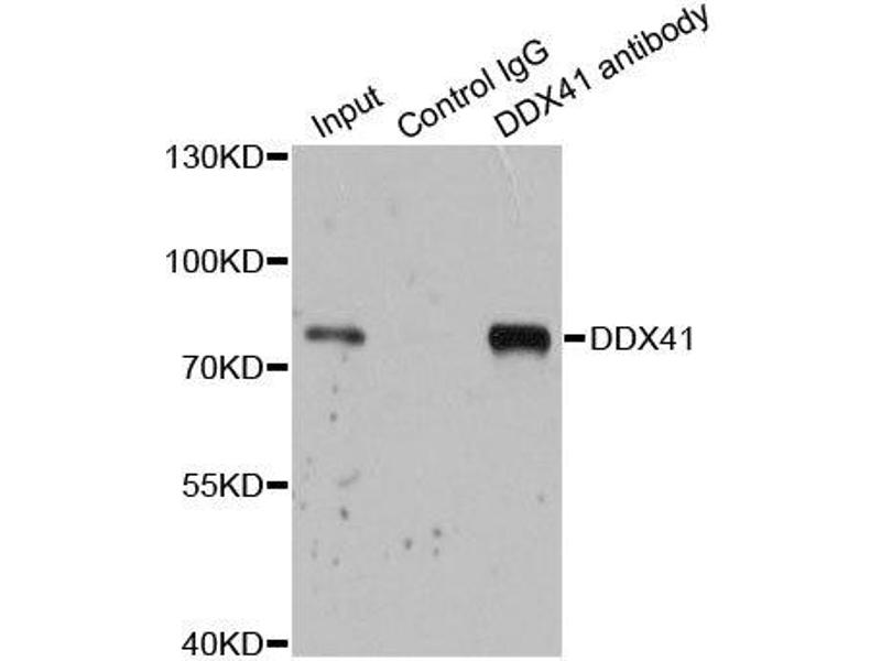- DEAD box proteins, characterized by the conserved motif Asp-Glu-Ala-Asp (DEAD), are putative RNA helicases. They are implicated in a number of cellular processes involving alteration of RNA secondary structure, such as translation initiation, nuclear and mitochondrial splicing, and ribosome and spliceosome assembly. Based on their distribution patterns, some members of the DEAD box protein family are believed to be involved in embryogenesis, spermatogenesis, and cellular growth and division. The protein encoded by this gene is a member of the DEAD box protein family and interacts with several spliceosomal proteins. In addition, the encoded protein may recognize the bacterial second messengers cyclic di-GMP and cyclic di-AMP, resulting in the induction of genes involved in the innate immune response.,DDX41,ABS,MPLPF,Epigenetics & Nuclear Signaling,RNA Binding,Cell Biology & Developmental Biology,Apoptosis,DDX41