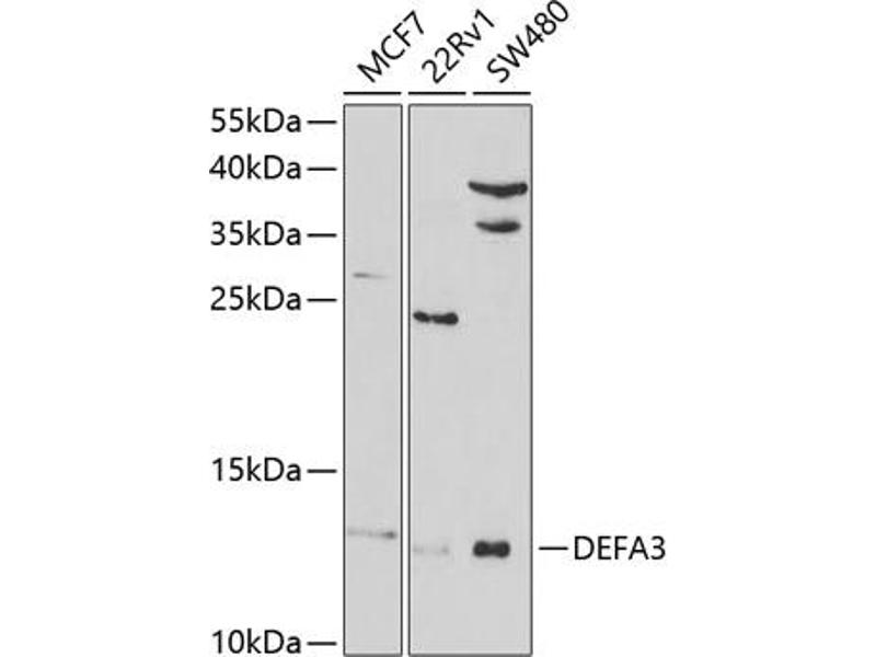 Defensins are a family of antimicrobial and cytotoxic peptides thought to be involved in host defense. They are abundant in the granules of neutrophils and also found in the epithelia of mucosal surfaces such as those of the intestine, respiratory tract, urinary tract, and vagina. Members of the defensin family are highly similar in protein sequence and distinguished by a conserved cysteine motif. The protein encoded by this gene, defensin, alpha 3, is found in the microbicidal granules of neutrophils and likely plays a role in phagocyte-mediated host defense. Several alpha defensin genes are clustered on chromosome 8. This gene differs from defensin, alpha 1 by only one amino acid. This gene and the gene encoding defensin, alpha 1 are both subject to copy number variation.,DEFA3,DEF3,HNP-3,HNP3,HP-3,HP3,DEFA3