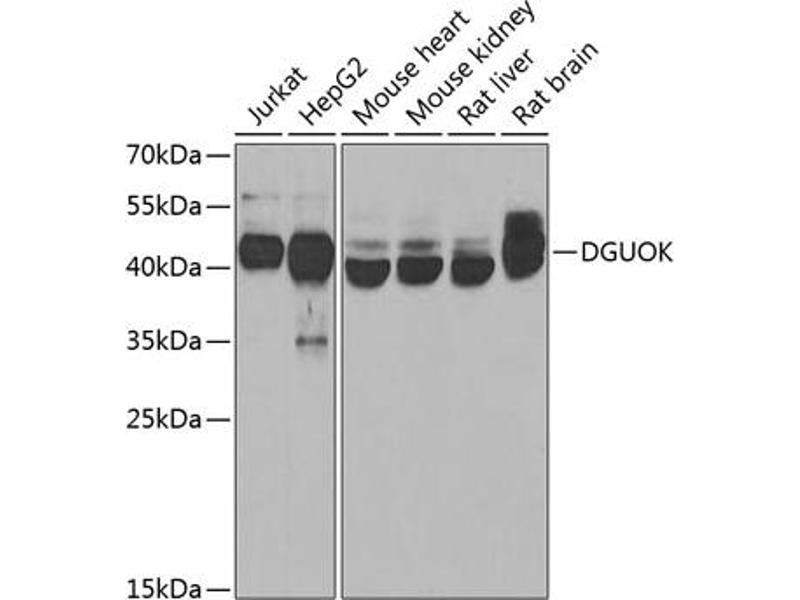 - In mammalian cells, the phosphorylation of purine deoxyribonucleosides is mediated predominantly by two deoxyribonucleoside kinases, cytosolic deoxycytidine kinase and mitochondrial deoxyguanosine kinase. The protein encoded by this gene is responsible for phosphorylation of purine deoxyribonucleosides in the mitochondrial matrix. In addition, this protein phosphorylates several purine deoxyribonucleoside analogs used in the treatment of lymphoproliferative disorders, and this phosphorylation is critical for the effectiveness of the analogs. Alternative splice variants encoding different protein isoforms have been described for this gene.,DGUOK,MTDPS3,NCPH,PEOB4,dGK,Signal Transduction,Kinase,DGUOK