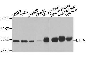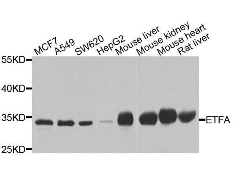 - ETFA participates in catalyzing the initial step of the mitochondrial fatty acid beta-oxidation. It shuttles electrons between primary flavoprotein dehydrogenases and the membrane-bound electron transfer flavoprotein ubiquinone oxidoreductase. Defects in electron-transfer-flavoprotein have been implicated in type II glutaricaciduria in which multiple acyl-CoA dehydrogenase deficiencies result in large excretion of glutaric, lactic, ethylmalonic, butyric, isobutyric, 2-methyl-butyric, and isovaleric acids. Two transcript variants encoding different isoforms have been found for this gene.,ETFA,EMA,GA2,MADD,Cancer,Signal Transduction,Endocrine & Metabolism,Mitochondrial metabolism,Mitochondrial markers,ETFA