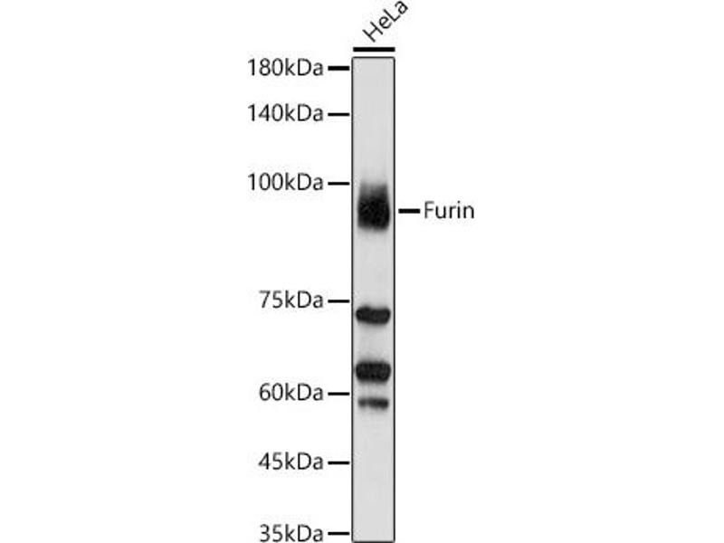 This gene encodes a member of the subtilisin-like proprotein convertase family, which includes proteases that process protein and peptide precursors trafficking through regulated or constitutive branches of the secretory pathway. It encodes a type 1 membrane bound protease that is expressed in many tissues, including neuroendocrine, liver, gut, and brain. The encoded protein undergoes an initial autocatalytic processing event in the ER and then sorts to the trans-Golgi network through endosomes where a second autocatalytic event takes place and the catalytic activity is acquired. The product of this gene is one of the seven basic amino acid-specific members which cleave their substrates at single or paired basic residues. Some of its substrates include proparathyroid hormone, transforming growth factor beta 1 precursor, proalbumin, pro-beta-secretase, membrane type-1 matrix metalloproteinase, beta subunit of pro-nerve growth factor and von Willebrand factor. It is also thought to be one of the proteases responsible for the activation of HIV envelope glycoproteins gp160 and gp140 and may play a role in tumor progression. This gene is located in close proximity to family member proprotein convertase subtilisin/kexin type 6 and upstream of the FES oncogene. Alternative splicing results in multiple transcript variants.,FURIN,FUR,PACE,PCSK3,SPC1,furin,Signal Transduction,Cell Biology & Developmental Biology,Cell Adhesion,Cytoskeleton,Ubiquitin,Notch Signaling Pathway,Endocrine & Metabolism,FURIN