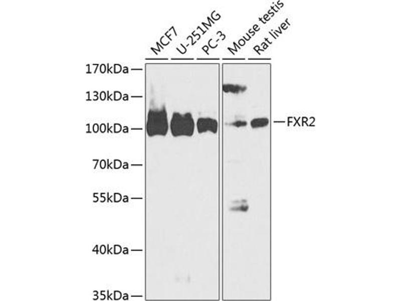 The protein encoded by this gene is a RNA binding protein containing two KH domains and one RCG box, which is similar to FMRP and FXR1. It associates with polyribosomes, predominantly with 60S large ribosomal subunits. This encoded protein may self-associate or interact with FMRP and FXR1. It may have a role in the development of fragile X mental retardation syndrome.,FXR2,FMR1L2,FXR2P,Epigenetics & Nuclear Signaling,RNA Binding,Neuroscience,Cell Type Marker,Neurodegenerative Diseases,Neuron marker,Dendrite marker,Synapse marker,FXR2
