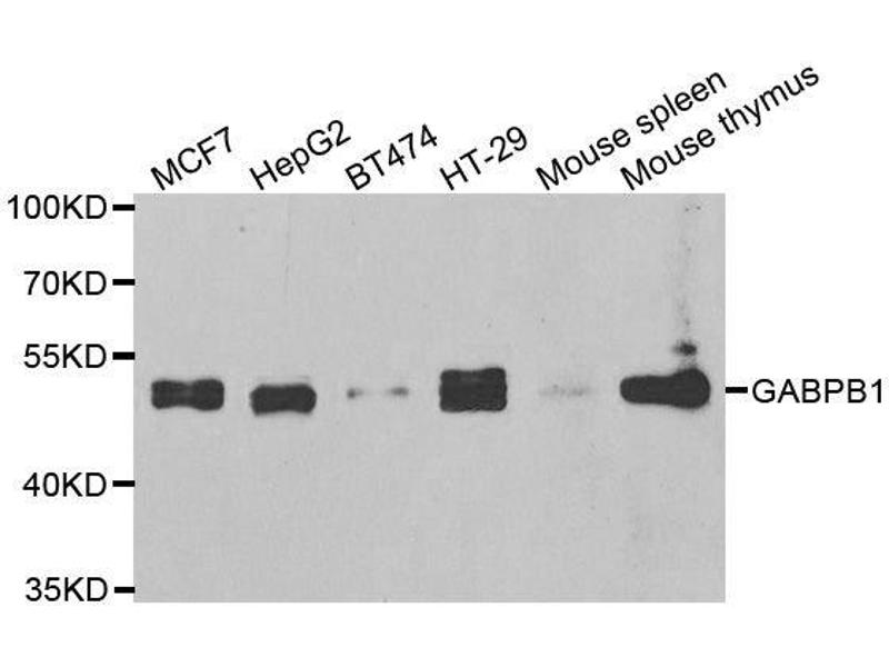 - This gene encodes the GA-binding protein transcription factor, beta subunit. This protein forms a tetrameric complex with the alpha subunit, and stimulates transcription of target genes. The encoded protein may be involved in activation of cytochrome oxidase expression and nuclear control of mitochondrial function. The crystal structure of a similar protein in mouse has been resolved as a ternary protein complex. Multiple transcript variants encoding distinct isoforms have been identified for this gene.,GABPB1,BABPB2,E4TF1,E4TF1-47,E4TF1-53,E4TF1B,GABPB,GABPB-1,GABPB2,NRF2B1,NRF2B2,Epigenetics & Nuclear Signaling,Transcription Factors,Endocrine & Metabolism,Mitochondrial metabolism,GABPB1
