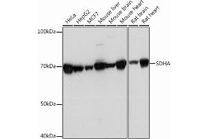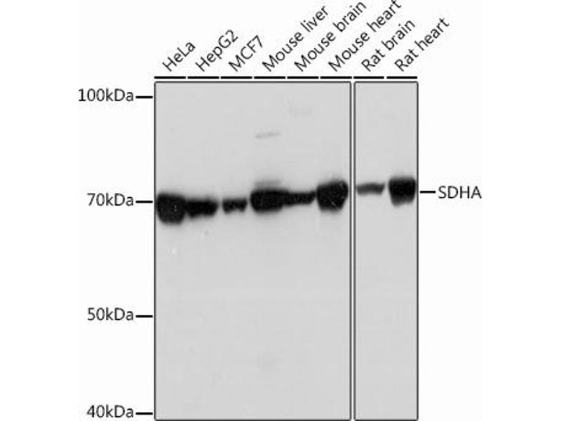 This gene encodes a major catalytic subunit of succinate-ubiquinone oxidoreductase, a complex of the mitochondrial respiratory chain. The complex is composed of four nuclear-encoded subunits and is localized in the mitochondrial inner membrane. Mutations in this gene have been associated with a form of mitochondrial respiratory chain deficiency known as Leigh Syndrome. A pseudogene has been identified on chromosome 3q29. Alternatively spliced transcript variants encoding different isoforms have been found for this gene. [provided by RefSeq, Jun 2014],CMD1GG, FP, PGL5, SDH1, SDH2, SDHF,Cancer,Cell Biology & Developmental Biology,Endocrine & Metabolism,Mitochondrial metabolism,Mitochondrial metabolism_Mitochondrial markers,Mitochondrial metabolism_Oxidative phosphorylation,Neurodegenerative Diseases,Neuroscience,Signal Transduction,SDHA