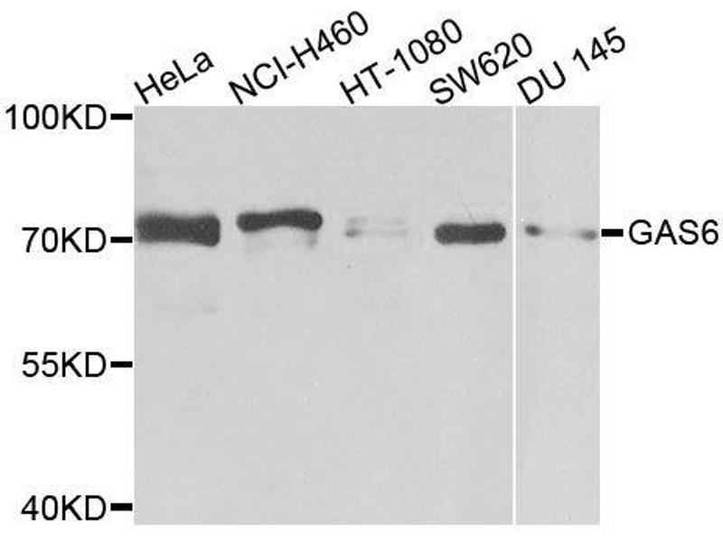 - This gene encodes a gamma-carboxyglutamic acid (Gla)-containing protein thought to be involved in the stimulation of cell proliferation. This gene is frequently overexpressed in many cancers and has been implicated as an adverse prognostic marker. Elevated protein levels are additionally associated with a variety of disease states, including venous thromboembolic disease, systemic lupus erythematosus, chronic renal failure, and preeclampsia.,GAS6,AXLLG,AXSF,Signal Transduction,Kinase,Tyrosine kinases,Stem Cells,Hematopoietic Progenitors,Mesenchymal Stem Cells,Cardiovascular,GAS6
