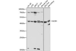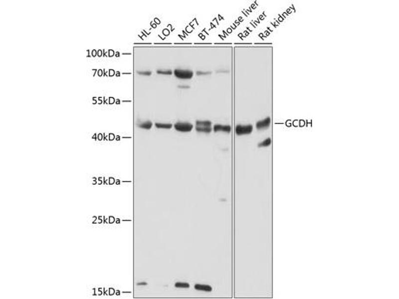 - The protein encoded by this gene belongs to the acyl-CoA dehydrogenase family. It catalyzes the oxidative decarboxylation of glutaryl-CoA to crotonyl-CoA and CO(2) in the degradative pathway of L-lysine, L-hydroxylysine, and L-tryptophan metabolism. It uses electron transfer flavoprotein as its electron acceptor. The enzyme exists in the mitochondrial matrix as a homotetramer of 45-kD subunits. Mutations in this gene result in the metabolic disorder glutaric aciduria type 1, which is also known as glutaric acidemia type I. Alternative splicing of this gene results in multiple transcript variants. A related pseudogene has been identified on chromosome 12.,GCDH,ACAD5,GCD,Cancer,Signal Transduction,Endocrine & Metabolism,Mitochondrial metabolism,Mitochondrial markers,Amino acid metabolism,GCDH