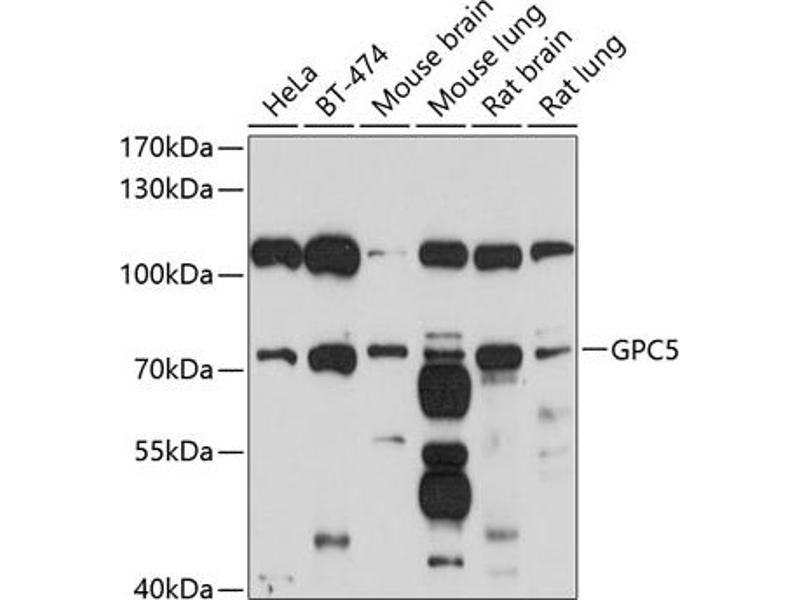 Cell surface heparan sulfate proteoglycans are composed of a membrane-associated protein core substituted with a variable number of heparan sulfate chains. Members of the glypican-related integral membrane proteoglycan family (GRIPS) contain a core protein anchored to the cytoplasmic membrane via a glycosyl phosphatidylinositol linkage. These proteins may play a role in the control of cell division and growth regulation.,GPC5,Signal Transduction,Cell Biology & Developmental Biology,Cytoskeleton,GPC5