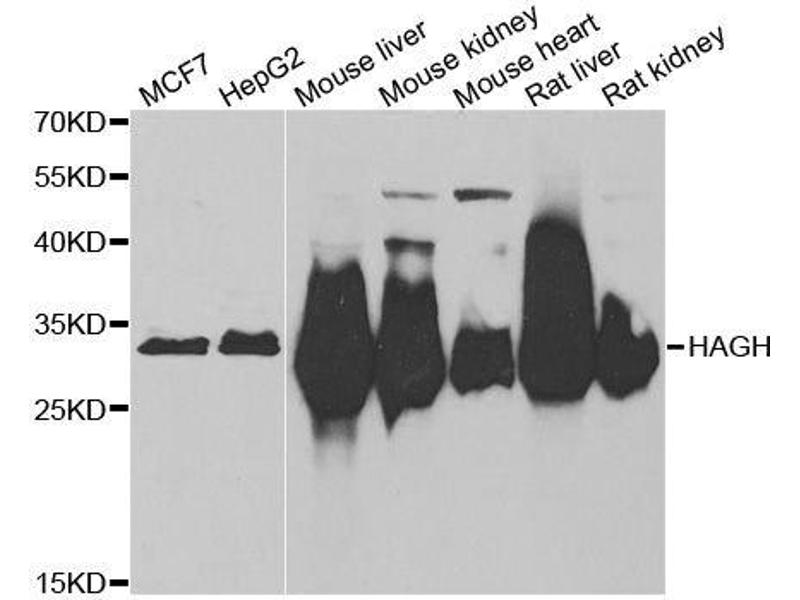 - The enzyme encoded by this gene is classified as a thiolesterase and is responsible for the hydrolysis of S-lactoyl-glutathione to reduced glutathione and D-lactate. Three transcript variants encoding different isoforms have been found for this gene.,HAGH,GLO2,GLX2,GLXII,HAGH1,Cell Biology & Developmental Biology,Endocrine & Metabolism,Neuroscience,Neurodegenerative Diseases,Amyloid Plaque and Neurofibrillary Tangle Formation in Alzheimer's Disease,HAGH