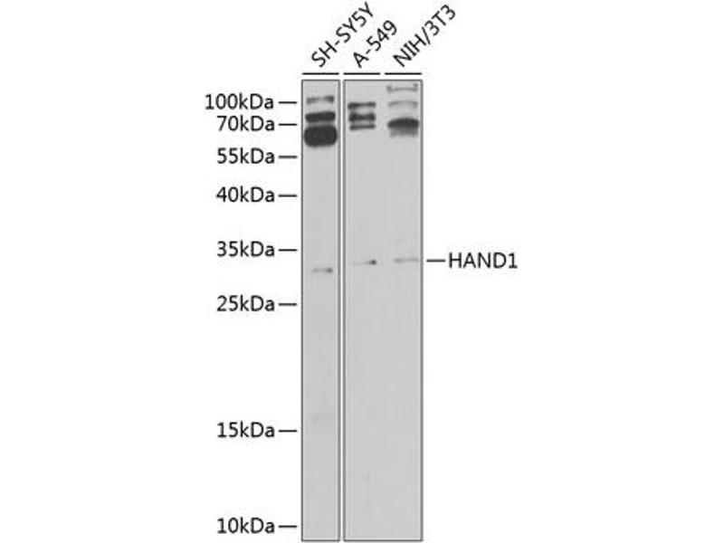 The protein encoded by this gene belongs to the basic helix-loop-helix family of transcription factors. This gene product is one of two closely related family members, the HAND proteins, which are asymmetrically expressed in the developing ventricular chambers and play an essential role in cardiac morphogenesis. Working in a complementary fashion, they function in the formation of the right ventricle and aortic arch arteries, implicating them as mediators of congenital heart disease. In addition, it has been suggested that this transcription factor may be required for early trophoblast differentiation.,HAND1,Hxt,Thing1,bHLHa27,eHand,Epigenetics & Nuclear Signaling,Transcription Factors,Cell Biology & Developmental Biology,Stem Cells,Cardiovascular,Angiogenesis,Heart,Cardiogenesis,HAND1