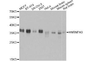 - This gene belongs to the A/B subfamily of ubiquitously expressed heterogeneous nuclear ribonucleoproteins (hnRNPs). The hnRNPs are RNA binding proteins and they complex with heterogeneous nuclear RNA (hnRNA). These proteins are associated with pre-mRNAs in the nucleus and appear to influence pre-mRNA processing and other aspects of mRNA metabolism and transport. While all of the hnRNPs are present in the nucleus, some seem to shuttle between the nucleus and the cytoplasm. The hnRNP proteins have distinct nucleic acid binding properties. The protein encoded by this gene has two repeats of quasi-RRM domains that bind RNAs, followed by a glycine-rich C-terminus.,HNRNPA0,HNRPA0,Epigenetics & Nuclear Signaling,RNA Binding,HNRNPA0