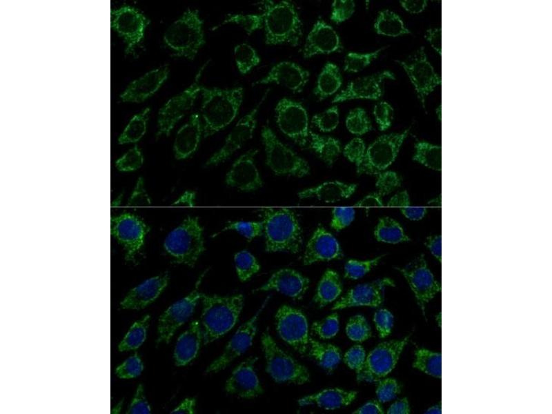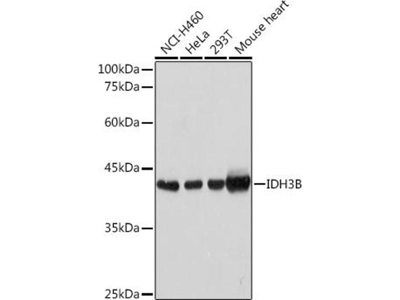 Isocitrate dehydrogenases catalyze the oxidative decarboxylation of isocitrate to 2-oxoglutarate. These enzymes belong to two distinct subclasses, one of which utilizes NAD(+) as the electron acceptor and the other NADP(+). Five isocitrate dehydrogenases have been reported: three NAD(+)-dependent isocitrate dehydrogenases, which localize to the mitochondrial matrix, and two NADP(+)-dependent isocitrate dehydrogenases, one of which is mitochondrial and the other predominantly cytosolic. NAD(+)-dependent isocitrate dehydrogenases catalyze the allosterically regulated rate-limiting step of the tricarboxylic acid cycle. Each isozyme is a heterotetramer that is composed of two alpha subunits, one beta subunit, and one gamma subunit. The protein encoded by this gene is the beta subunit of one isozyme of NAD(+)-dependent isocitrate dehydrogenase. Multiple alternatively spliced transcript variants encoding different isoforms have been described for this gene.,IDH3B,RP46,Cancer,Signal Transduction,Endocrine & Metabolism,Mitochondrial metabolism,Mitochondrial markers,IDH3B
