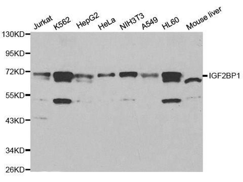 This gene encodes a member of the insulin-like growth factor 2 mRNA-binding protein family. The protein encoded by this gene contains four K homology domains and two RNA recognition motifs. It functions by binding to the mRNAs of certain genes, including insulin-like growth factor 2, beta-actin and beta-transducin repeat-containing protein, and regulating their translation. Two transcript variants encoding different isoforms have been found for this gene.,IGF2BP1,CRD-BP,CRDBP,IMP-1,IMP1,VICKZ1,ZBP1,Epigenetics & Nuclear Signaling,RNA Binding,Nuclear Receptor Signaling,IGF2BP1