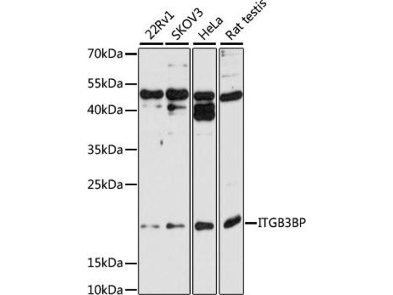 This gene encodes a transcriptional coregulator that binds to and enhances the activity of members of the nuclear receptor families, thyroid hormone receptors and retinoid X receptors. This protein also acts as a corepressor of NF-kappaB-dependent signaling. This protein induces apoptosis in breast cancer cells through a caspase 2-mediated signaling pathway. This protein is also a component of the centromere-specific histone H3 variant nucleosome associated complex (CENP-NAC) and may be involved in mitotic progression by recruiting the histone H3 variant CENP-A to the centromere. Alternate splicing results in multiple transcript variants.,ITGB3BP,CENP-R,CENPR,HSU37139,NRIF3,TAP20,Epigenetics & Nuclear Signaling,Nuclear Receptor Signaling,Nuclear hormone receptors,Signal Transduction,Cell Biology & Developmental Biology,Apoptosis,Cell Cycle,Centromere,Cell Adhesion,Cytoskeleton,ITGB3BP
