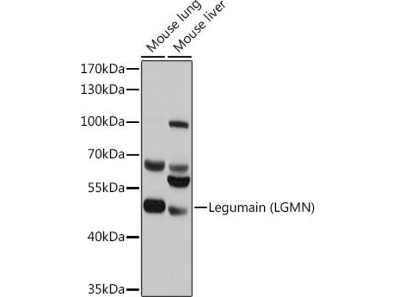 This gene encodes a cysteine protease that has a strict specificity for hydrolysis of asparaginyl bonds. This enzyme may be involved in the processing of bacterial peptides and endogenous proteins for MHC class II presentation in the lysosomal/endosomal systems. Enzyme activation is triggered by acidic pH and appears to be autocatalytic. Protein expression occurs after monocytes differentiate into dendritic cells. A fully mature, active enzyme is produced following lipopolysaccharide expression in mature dendritic cells. Overexpression of this gene may be associated with the majority of solid tumor types. This gene has a pseudogene on chromosome 13. Several alternatively spliced transcript variants have been described, but the biological validity of only two has been determined. These two variants encode the same isoform.,LGMN,AEP,LGMN1,PRSC1,legumain,Cancer,Signal Transduction,Cell Biology & Developmental Biology,Cytoskeleton,Extracellular Matrix,Bone,Ubiquitin,Endocrine & Metabolism,Immunology & Inflammation,LGMN