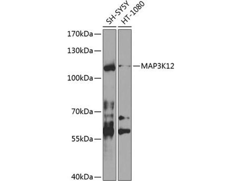 This gene encodes a member of the serine/threonine protein kinase family. This kinase contains a leucine-zipper domain and is predominately expressed in neuronal cells. The phosphorylation state of this kinase in synaptic terminals was shown to be regulated by membrane depolarization via calcineurin. This kinase forms heterodimers with leucine zipper containing transcription factors, such as cAMP responsive element binding protein (CREB) and MYC, and thus may play a regulatory role in PKA or retinoic acid induced neuronal differentiation. Alternatively spliced transcript variants encoding different proteins have been described.,MAP3K12,DLK,MEKK12,MUK,ZPK,ZPKP1,Signal Transduction,Kinase,MAPK-JNK Signaling Pathway,MAPK-P38 Signaling Pathway,Cell Biology & Developmental Biology,Cytoskeleton,Actins,Immunology & Inflammation,B Cell Receptor Signaling Pathway,MAP3K12
