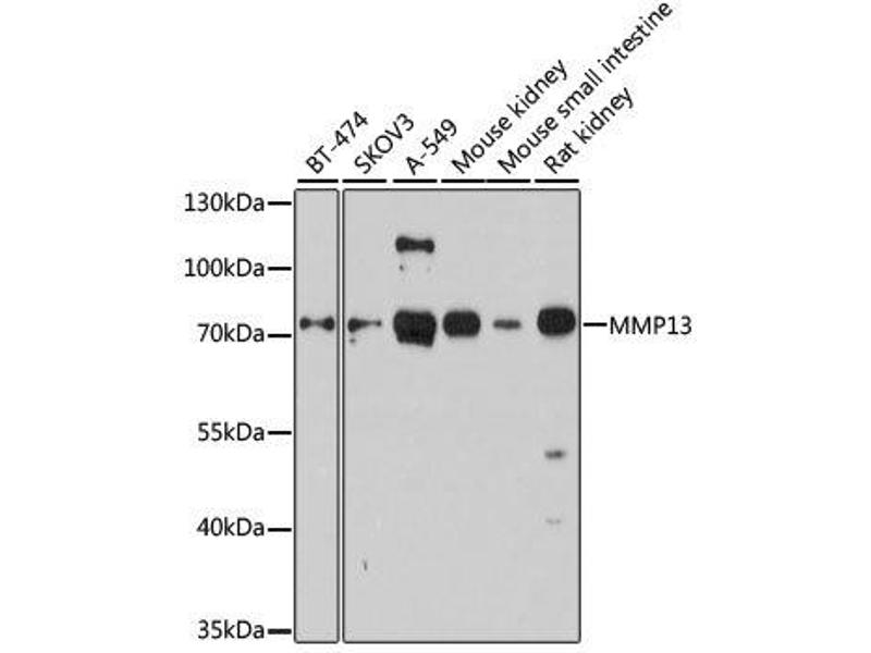 This gene encodes a member of the peptidase M10 family of matrix metalloproteinases (MMPs). Proteins in this family are involved in the breakdown of extracellular matrix in normal physiological processes, such as embryonic development, reproduction, and tissue remodeling, as well as in disease processes, such as arthritis and metastasis. The encoded preproprotein is proteolytically processed to generate the mature protease. This protease cleaves type II collagen more efficiently than types I and III. It may be involved in articular cartilage turnover and cartilage pathophysiology associated with osteoarthritis. Mutations in this gene are associated with metaphyseal anadysplasia. This gene is part of a cluster of MMP genes on chromosome 11.,MMP13,CLG3,MANDP1,MDST,MMP-13,Cancer,Tumor biomarkers,Invasion and Metastasis,Signal Transduction,G protein signaling,G2/M DNA Damage Checkpoint,Cell Biology & Developmental Biology,Cytoskeleton,Extracellular Matrix,MMPs,Ubiquitin,Cardiovascular,Angiogenesis,MMP13