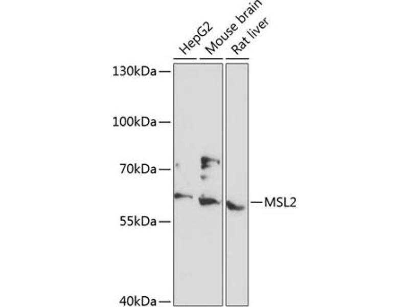 - Component of histone acetyltransferase complex responsible for the majority of histone H4 acetylation at lysine 16 which is implicated in the formation of higher-order chromatin structure. Acts as an E3 ubiquitin ligase that promotes monoubiquitination of histone H2B at 'Lys-35' (H2BK34Ub, but not that of H2A. This activity is greatly enhanced by heterodimerization with MSL1. H2B ubiquitination in turn stimulates histone H3 methylation at 'Lys-4' (H3K4me and 'Lys-79' (H3K79me and leads to gene activation, including that of HOXA9 and MEIS1.,MSL2,MSL-2,MSL2L1,RNF184,Epigenetics & Nuclear Signaling,MSL2