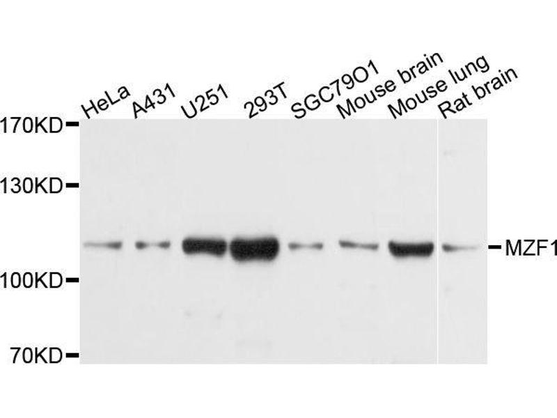 - Binds to target promoter DNA and functions as transcription regulator. Regulates transcription from the PADI1 and CDH2 promoter. May be one regulator of transcriptional events during hemopoietic development.,MZF1,MZF-1,MZF1B,ZFP98,ZNF42,ZSCAN6,Epigenetics & Nuclear Signaling,Transcription Factors,MZF1