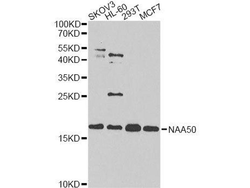 N-alpha-acetyltransferase that acetylates the N-terminus of proteins that retain their initiating methionine. Has a broad substrate specificity: able to acetylate the initiator methionine of most peptides, except for those with a proline in second position. Also displays N-epsilon-acetyltransferase activity by mediating acetylation of the side chain of specific lysines on proteins. Autoacetylates in vivo. The relevance of N-epsilon-acetyltransferase activity is however unclear: able to acetylate H4 in vitro, but this result has not been confirmed in vivo. Component of N-alpha-acetyltransferase complexes containing NAA10 and NAA15, which has N-alpha-acetyltransferase activity. Does not influence the acetyltransferase activity of NAA10. However, it negatively regulates the N-alpha-acetyltransferase activity of the N-terminal acetyltransferase A complex (also called the NatA complex. The multiprotein complexes probably constitute the major contributor for N-terminal acetylation at the ribosome exit tunnel, with NAA10 acetylating all amino termini that are devoid of methionine and NAA50 acetylating other peptides. Required for sister chromatid cohesion during mitosis by promoting binding of CDCA5/sororin to cohesin: may act by counteracting the function of NAA10.,NAA50,MAK3,NAT13,NAT13P,NAT5,NAT5P,SAN,Epigenetics & Nuclear Signaling,Cell Biology & Developmental Biology,NAA50