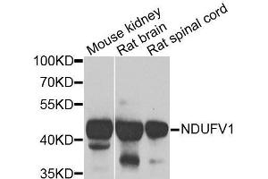 The mitochondrial respiratory chain provides energy to cells via oxidative phosphorylation and consists of four membrane-bound electron-transporting protein complexes (I-IV) and an ATP synthase (complex V). This gene encodes a 51 kDa subunit of the NADH:ubiquinone oxidoreductase complex I, a large complex with at least 45 nuclear and mitochondrial encoded subunits that liberates electrons from NADH and channels them to ubiquinone. This subunit carries the NADH-binding site as well as flavin mononucleotide (FMN)- and Fe-S-biding sites. Defects in complex I are a common cause of mitochondrial dysfunction, a syndrome that occurs in approximately 1 in 10,000 live births. Mitochondrial complex I deficiency is linked to myopathies, encephalomyopathies, and neurodegenerative disorders such as Parkinson's disease and Leigh syndrome. Alternative splicing results in multiple transcript variants encoding distinct isoforms.,NDUFV1,CI-51K,CI51KD,UQOR1,Cancer,Signal Transduction,Endocrine & Metabolism,Mitochondrial metabolism,Mitochondrial markers,Oxidative phosphorylation,Neuroscience,Neurodegenerative Diseases,NDUFV1