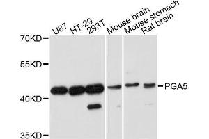 - This gene encodes a protein precursor of the digestive enzyme pepsin, a member of the peptidase A1 family of endopeptidases. The encoded precursor is secreted by gastric chief cells and undergoes autocatalytic cleavage in acidic conditions to form the active enzyme, which functions in the digestion of dietary proteins. This gene is found in a cluster of related genes on chromosome 11, each of which encodes one of multiple pepsinogens. Pepsinogen levels in serum may serve as a biomarker for atrophic gastritis and gastric cancer.,PGA5,Pg5,Cancer,Signal Transduction,Cell Biology & Developmental Biology,Ubiquitin,Endocrine & Metabolism,PGA5