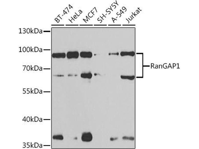 This gene encodes a protein that associates with the nuclear pore complex and participates in the regulation of nuclear transport. The encoded protein interacts with Ras-related nuclear protein 1 (RAN) and regulates guanosine triphosphate (GTP)-binding and exchange. Alternative splicing results in multiple transcript variants.,RANGAP1,Fug1,RANGAP,SD,Epigenetics & Nuclear Signaling,Nuclear Receptor Signaling,Cell Biology & Developmental Biology,Cell Cycle,RANGAP1