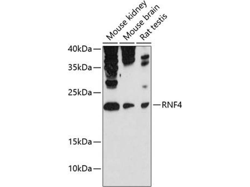 The protein encoded by this gene contains a RING finger motif and acts as a transcription regulator. This protein has been shown to interact with, and inhibit the activity of, TRPS1, a transcription suppressor of GATA-mediated transcription. Transcription repressor ZNF278/PATZ is found to interact with this protein, and thus reduce the enhancement of androgen receptor-dependent transcription mediated by this protein. Studies of the mouse and rat counterparts suggested a role of this protein in spermatogenesis. A pseudogene of this gene is found on chromosome 1.,RNF4,RES4-26,SLX5,SNURF,Epigenetics & Nuclear Signaling,DNA Damage & Repair,Cell Biology & Developmental Biology,Ubiquitin,RNF4