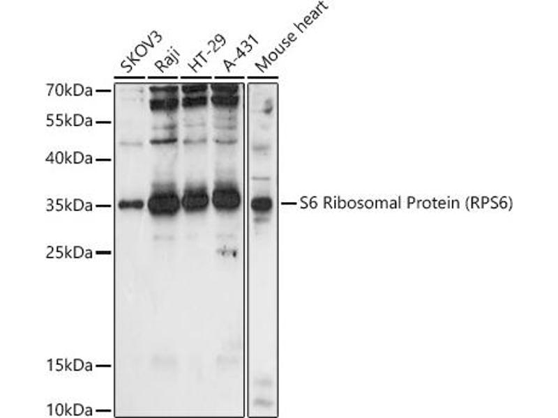 Ribosomes, the organelles that catalyze protein synthesis, consist of a small 40S subunit and a large 60S subunit. Together these subunits are composed of 4 RNA species and approximately 80 structurally distinct proteins. This gene encodes a cytoplasmic ribosomal protein that is a component of the 40S subunit. The protein belongs to the S6E family of ribosomal proteins. It is the major substrate of protein kinases in the ribosome, with subsets of five C-terminal serine residues phosphorylated by different protein kinases. Phosphorylation is induced by a wide range of stimuli, including growth factors, tumor-promoting agents, and mitogens. Dephosphorylation occurs at growth arrest. The protein may contribute to the control of cell growth and proliferation through the selective translation of particular classes of mRNA. As is typical for genes encoding ribosomal proteins, there are multiple processed pseudogenes of this gene dispersed through the genome.,RPS6,S6,RPS6,Epigenetics & Nuclear Signaling,RNA Binding,Translation Control,Regulation of eIF4 and p70 S6 Kinase,Signal Transduction,PI3K-Akt Signaling Pathway,MAPK-Erk Signaling Pathway,Akt downstream targets,RPS6