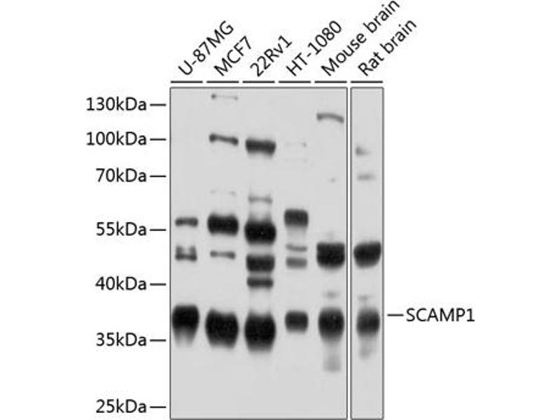 - This gene product belongs to the SCAMP family of proteins, which are secretory carrier membrane proteins. They function as carriers to the cell surface in post-golgi recycling pathways. Different family members are highly related products of distinct genes, and are usually expressed together. These findings suggest that these protein family members may function at the same site during vesicular transport rather than in separate pathways. A pseudogene of this gene has been defined on chromosome 1. Alternative splicing results in multiple transcript variants.,SCAMP1,SCAMP,SCAMP37,Signal Transduction,Neuroscience,SCAMP1
