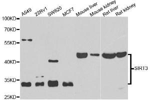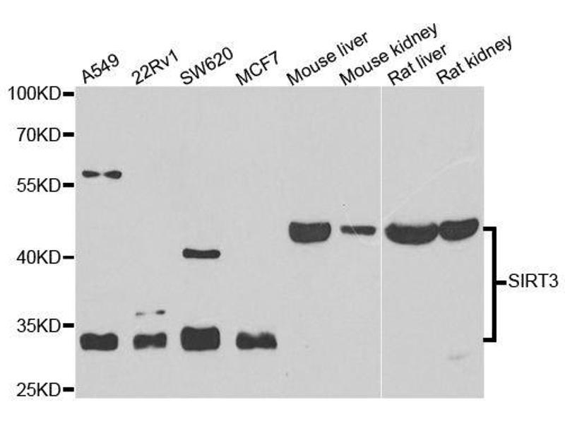- A synthetic peptide corresponding to a sequence within amino acids 300 to the C-terminus of human SIRT3 (NP_036371.1).