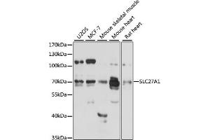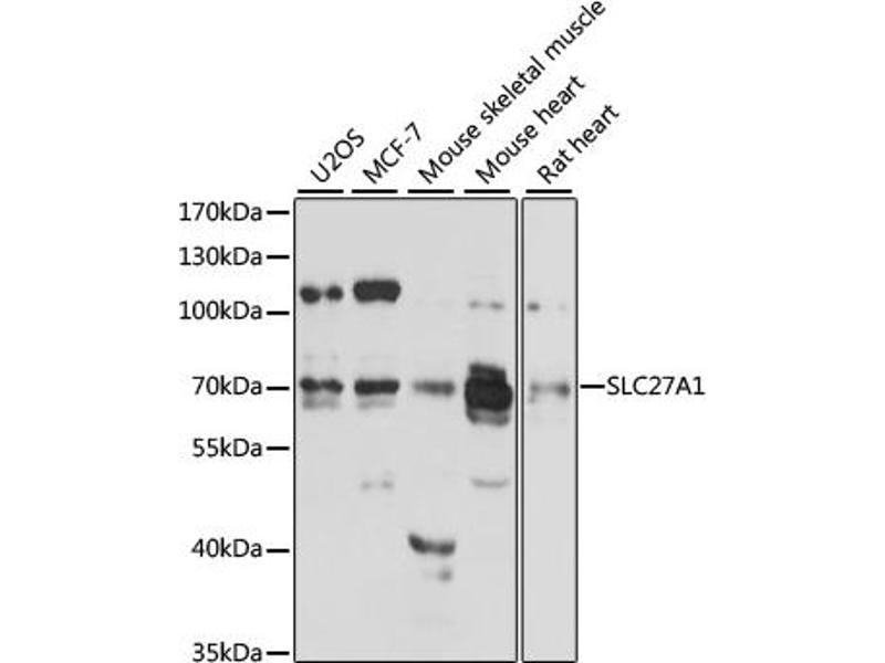 Mediates the ATP-dependent import of long-chain fatty acids (LCFA into the cell by mediating their translocation at the plasma membrane. Has also an acyl-CoA ligase activity for long-chain and very-long-chain fatty acids. May act directly as a bona fide transporter, or alternatively, in a cytoplasmic or membrane-associated multimeric protein complex to trap and draw fatty acids towards accumulation. Plays a pivotal role in regulating available LCFA substrates from exogenous sources in tissues undergoing high levels of beta-oxidation or triglyceride synthesis. May be involved in regulation of cholesterol metabolism (By similarity. Probably involved in fatty acid transport across the blood barrier.,SLC27A1,ACSVL5,FATP,FATP-1,FATP1,Cancer,Signal Transduction,Endocrine & Metabolism,Lipid Metabolism,Stem Cells,Cardiovascular,Lipids,Fatty Acids,SLC27A1