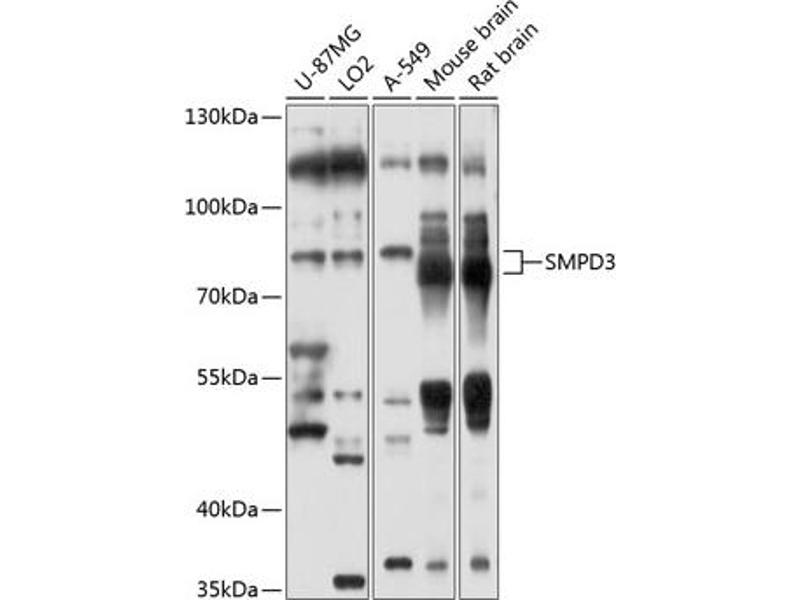 Catalyzes the hydrolysis of sphingomyelin to form ceramide and phosphocholine. Ceramide mediates numerous cellular functions, such as apoptosis and growth arrest, and is capable of regulating these 2 cellular events independently. Also hydrolyzes sphingosylphosphocholine. Regulates the cell cycle by acting as a growth suppressor in confluent cells. Probably acts as a regulator of postnatal development and participates in bone and dentin mineralization. Binds to anionic phospholipids (APLs such as phosphatidylserine (PS and phosphatidic acid (PA that modulate enzymatic activity and subcellular location. May be involved in IL-1-beta-induced JNK activation in hepatocytes (By similarity. May act as a mediator in transcriptional regulation of NOS2/iNOS via the NF-kappa-B activation under inflammatory conditions (By similarity.,SMPD3,NSMASE2,Cell Biology & Developmental Biology,Apoptosis,Neuroscience,Cell Type Marker,Neurodegenerative Diseases,Amyloid Plaque and Neurofibrillary Tangle Formation in Alzheimer's Disease,Oligodendrocyte marker,Neuron marker,SMPD3