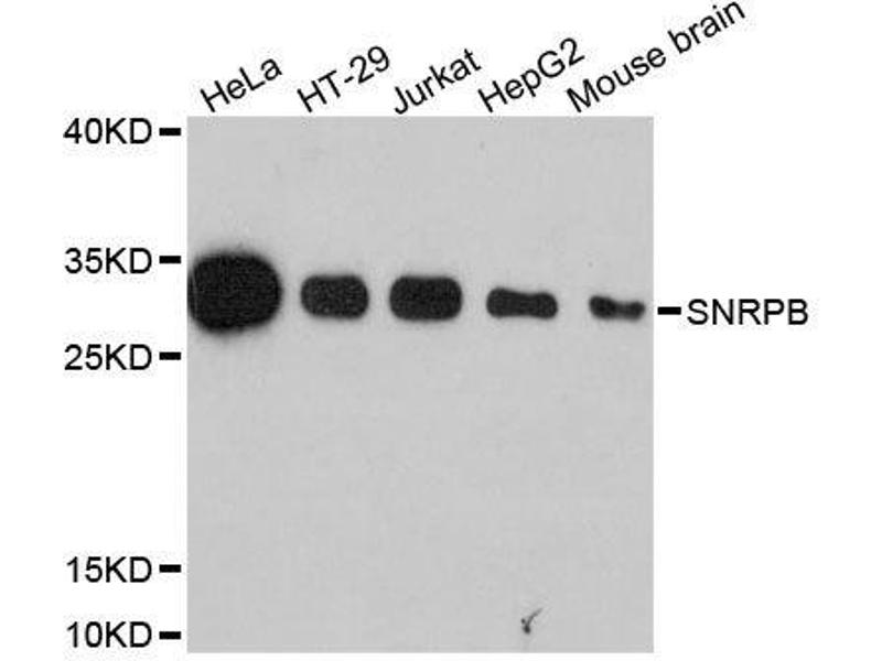 - A synthetic peptide corresponding to a sequence within amino acids 1-100 of human SNRPB (NP_003082.1).