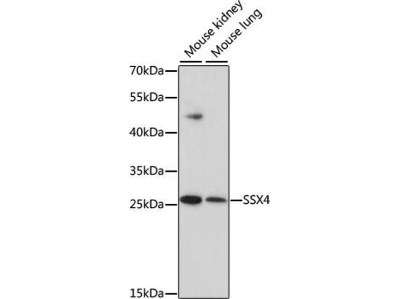 The product of this gene belongs to the family of highly homologous synovial sarcoma X (SSX) breakpoint proteins. These proteins may function as transcriptional repressors. They are also capable of eliciting spontaneously humoral and cellular immune responses in cancer patients, and are potentially useful targets in cancer vaccine-based immunotherapy. SSX1, SSX2 and SSX4 genes have been involved in the t(X,18) translocation characteristically found in all synovial sarcomas. This translocation results in the fusion of the synovial sarcoma translocation gene on chromosome 18 to one of the SSX genes on chromosome X. Chromosome Xp11 contains a segmental duplication resulting in two identical copies of synovial sarcoma, X breakpoint 4, SSX4 and SSX4B, in tail-to-tail orientation. This gene, SSX4, represents the more telomeric copy. Two transcript variants encoding distinct isoforms have been identified for this gene.,SSX4,CT5.4,SSX4