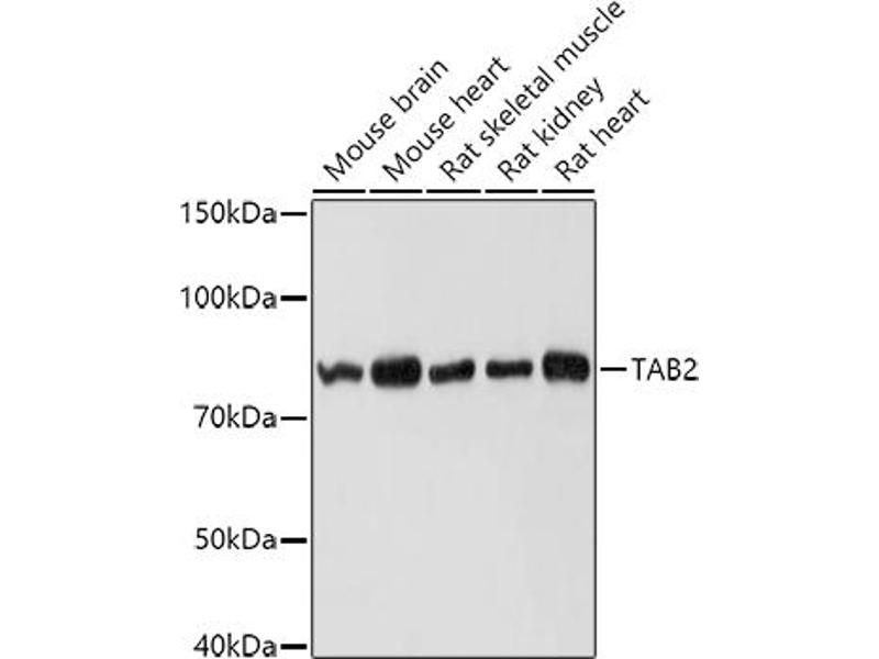 - The protein encoded by this gene is an activator of MAP3K7/TAK1, which is required for for the IL-1 induced activation of nuclear factor kappaB and MAPK8/JNK. This protein forms a kinase complex with TRAF6, MAP3K7 and TAB1, and it thus serves as an adaptor that links MAP3K7 and TRAF6. This protein, along with TAB1 and MAP3K7, also participates in the signal transduction induced by TNFSF11/RANKl through the activation of the receptor activator of NF-kappaB (TNFRSF11A/RANK), which may regulate the development and function of osteoclasts. Studies of the related mouse protein indicate that it functions to protect against liver damage caused by chemical stressors. Mutations in this gene cause congenital heart defects, multiple types, 2 (CHTD2). Alternative splicing results in multiple transcript variants.,TAB2,CHTD2,MAP3K7IP2,TAB-2,Signal Transduction,Kinase,ErbB-HER Signaling Pathway,Cell Biology & Developmental Biology,Apoptosis,Inhibition of Apoptosis,Wnt/β-Catenin Signaling Pathway,Immunology & Inflammation,NF-kB Signaling Pathway,Toll-like Receptor Signaling Pathway,Cell Intrinsic Innate Immunity Signaling Pathway,TLR Signaling,TAB2