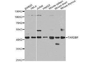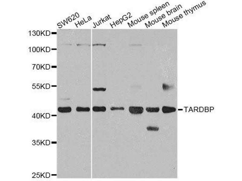 HIV-1, the causative agent of acquired immunodeficiency syndrome (AIDS), contains an RNA genome that produces a chromosomally integrated DNA during the replicative cycle. Activation of HIV-1 gene expression by the transactivator Tat is dependent on an RNA regulatory element (TAR) located downstream of the transcription initiation site. The protein encoded by this gene is a transcriptional repressor that binds to chromosomally integrated TAR DNA and represses HIV-1 transcription. In addition, this protein regulates alternate splicing of the CFTR gene. A similar pseudogene is present on chromosome 20.,ALS10,TDP-43,TARDBP,TDP43,Epigenetics & Nuclear Signaling,RNA Binding,Cell Biology & Developmental Biology,Apoptosis,Neuroscience,Neurodegenerative Diseases,Neurodegenerative Diseases Markers,Other Neurological disorders,Amyotrophic lateral sclerosis-ALS,TARDBP