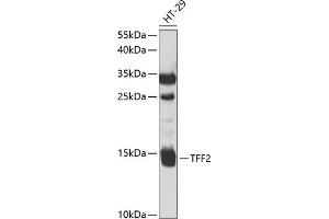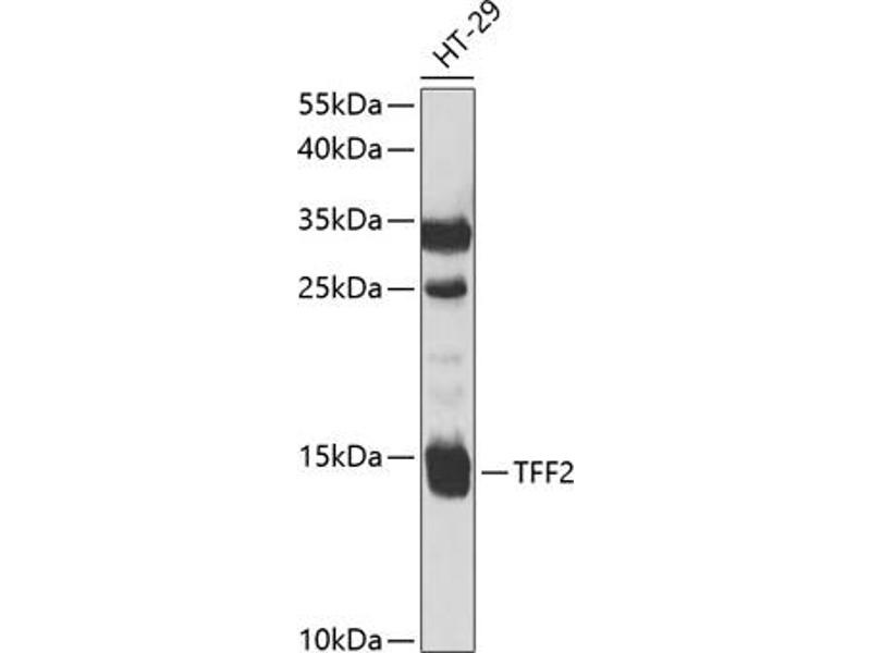 Members of the trefoil family are characterized by having at least one copy of the trefoil motif, a 40-amino acid domain that contains three conserved disulfides. They are stable secretory proteins expressed in gastrointestinal mucosa. Their functions are not defined, but they may protect the mucosa from insults, stabilize the mucus layer and affect healing of the epithelium. The encoded protein inhibits gastric acid secretion. This gene and two other related trefoil family member genes are found in a cluster on chromosome 21.,TFF2,SML1,SP,Cell Biology & Developmental Biology,TFF2