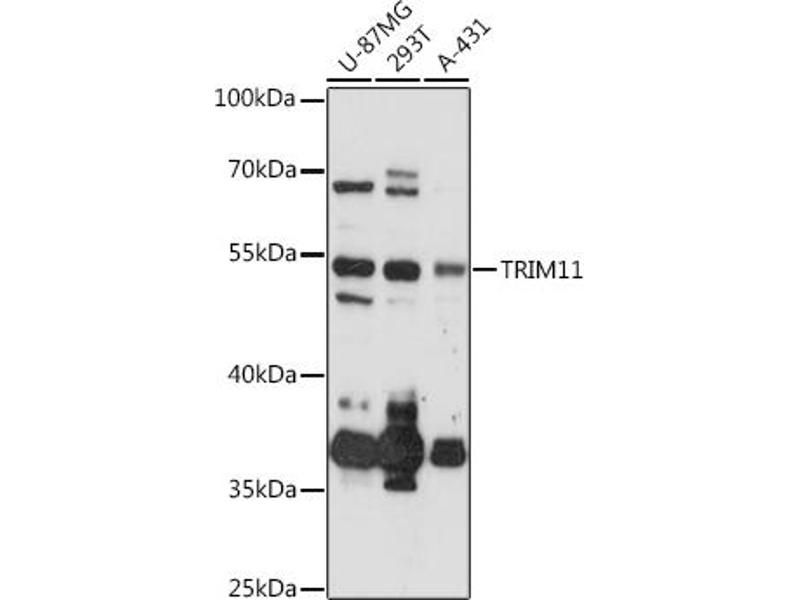 The protein encoded by this gene is a member of the tripartite motif (TRIM) family. The TRIM motif includes three zinc-binding domains, a RING, a B-box type 1 and a B-box type 2, and a coiled-coil region. This protein localizes to the nucleus and the cytoplasm. Its function has not been identified.,TRIM11,BIA1,RNF92,Cell Biology & Developmental Biology,Ubiquitin,Neuroscience,Neurodegenerative Diseases,Amyloid Plaque and Neurofibrillary Tangle Formation in Alzheimer's Disease,TRIM11