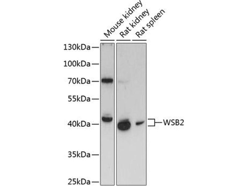 This gene encodes a member of the WD-protein subfamily. The encoded protein contains five WD-repeats spanning most of the protein and an SOCS box in the C-terminus. The SOCS box may act as a bridge between specific substrate-binding domains and E3 ubiquitin protein ligases. Three transcript variants encoding different isoforms have been found for this gene.,WSB2,SBA2,Cancer,Tumor biomarkers,Cell Biology & Developmental Biology,Ubiquitin,WSB2
