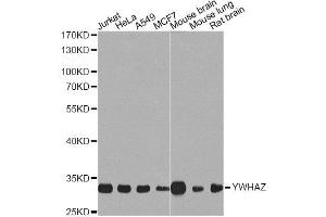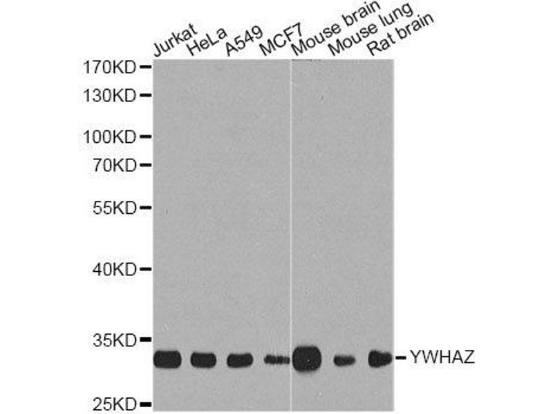 This gene product belongs to the 14-3-3 family of proteins which mediate signal transduction by binding to phosphoserine-containing proteins. This highly conserved protein family is found in both plants and mammals, and this protein is 99 % identical to the mouse, rat and sheep orthologs. The encoded protein interacts with IRS1 protein, suggesting a role in regulating insulin sensitivity. Several transcript variants that differ in the 5' UTR but that encode the same protein have been identified for this gene.,YWHAZ,14-3-3-zeta,HEL-S-3,HEL-S-93,HEL4,KCIP-1,YWHAD,Epigenetics & Nuclear Signaling,RNA Binding,Signal Transduction,PI3K-Akt Signaling Pathway,MAPK-Erk Signaling Pathway,MAPK-JNK Signaling Pathway,Cell Biology & Developmental Biology,Apoptosis,Mitochondrial Control of Apoptosis,Cell Cycle,G2/M DNA Damage Checkpoint,Cytoskeleton,Actins,Hippo Signaling Pathway,Immunology & Inflammation,Neuroscience,Cell Type Marker,Neurodegenerative Diseases,Amyloid Plaque and Neurofibrillary Tangle Formation in Alzheimer's Disease,Neurodegenerative Diseases Markers,YWHAZ