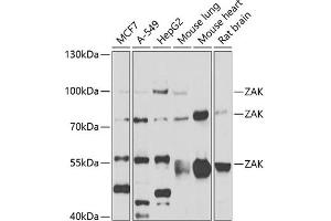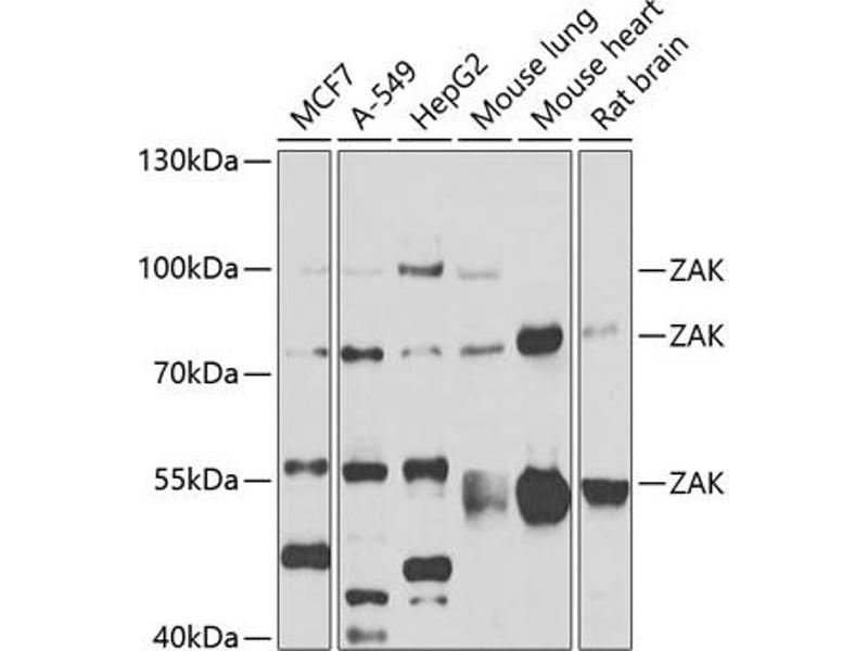 This gene is a member of the MAPKKK family of signal transduction molecules and encodes a protein with an N-terminal kinase catalytic domain, followed by a leucine zipper motif and a sterile-alpha motif (SAM). This magnesium-binding protein forms homodimers and is located in the cytoplasm. The protein mediates gamma radiation signaling leading to cell cycle arrest and activity of this protein plays a role in cell cycle checkpoint regulation in cells. The protein also has pro-apoptotic activity. Alternate transcriptional splice variants, encoding different isoforms, have been characterized.,MAP3K20,AZK,MLK7,MLT,MLTK,MLTKalpha,MLTKbeta,MRK,SFMMP,ZAK,mlklak,pk,Epigenetics & Nuclear Signaling,Signal Transduction,Kinase,MAPK-JNK Signaling Pathway,Cell Biology & Developmental Biology,Apoptosis,ZAK