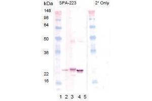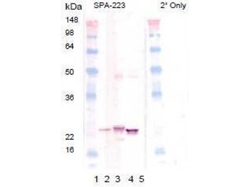 Alpha-crystallins composed of ~20 kDa alphaA and alphaB subunits function as major water-soluble proteins accounting for almost 50 % of total protein in the mammalian transparent eye lens, also existing in a variety of other tissues1. Crystallin families beta and gamma share homology with each other but not the alpha-crystallin family or the small heat shock protein (sHsp) family. sHsps including the alpha- crystallin proteins are induced by heat and other stress insults in a variety of organisms. The alpha-crystallins possess structural and functional similarities and share sequence homology with Hsp25/273. Most sHsps exhibit four common structural and functional features: monomeric molecular weight between 12 and 43 kDa, the formation of large oligomeric complexes especially for alphaA-crystallin, alphaB-crystallin and Hsp25/27, a moderately conserved alpha-crystallin domain in the central region of the protein, and molecular chaperone activity. The alpha-crystallin domain bounded by variable N-terminal and C-terminal extensions contains approximately 80 residues and participates in oligomer assembly. Oligomers, potentially 800 kDa or more, exhibit dynamic subunit exchanges and organizational plasticity, which may promote functional diversity. Phosphorylation of serine residues specifically for Hsp27 occurs in response to stress during development, typically decreasing oligomer size. Chaperone activity requires oligomerization (which, in turn, modulates the chaperone activity) and is confined to binding unfolded intermediates to prevent irreversible aggregation, even though productive release and refolding of denatured proteins requires close cooperation with other chaperones. Other proposed functions include a role in membrane stabilization and modulation of intermediate filament organization during physiological stress and neurodegenerative disease.Synonyms: Alpha(B)-crystallin, CRYA2, CRYAB, Heat shock protein beta-5, HspB5, Renal carcinoma antigen NY-REN-27, Rosenthal fiber component