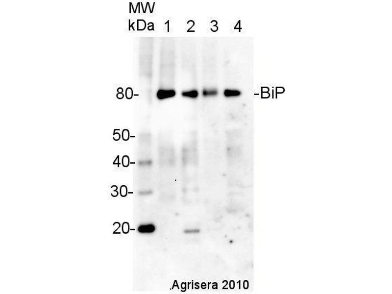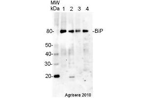 - KLH-conjugated synthetic peptide derived from Arabidopsis thaliana BiP proteins: BiP1 At5g28540 Q9LKR3, BiP2 At5g42020 F4K007 , BiP3 At1g09080 Q8H1B3