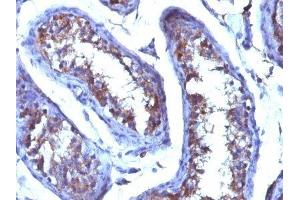 - This MAb is highly specific to testosterone. Its affinity constant for testosterone is ~1010 M-1. In competitive binding immunoassay, it reacts with testosterone 100 % , 11-beta-hydroxy testosterone 3.3 %, 17-alpha-methyl testosterone <0.1 %, 5-alpha DHT 0.8 %, estradiol <0.1 % and progesterone <0.1 %. Testosterone, a steroid hormone from the androgen group, is derived from cholesterol. Testosterone is primarily secreted in the testes, but the ovaries and adrenal glands also produce smaller amounts. It is the principal male sex hormone and is responsible for the maturation of sex organs and the development of male secondary sex characteristics. The hormone is also involved in the growth of muscle mass and increases bone density and maturation. It functions by activating the androgen receptor and converting to estradiol and activation of estrogen receptors. Testosterone has been employed therapeutically to treat many conditions including infertility, lack of libido, osteoporosis, height growth and bone marrow stimulation. Anti-testosterone antibody may also prove useful in identification of testicular tumors arising from interstitial cells. Primary antibodies are available purified, or with a selection of fluorescent CF® dyes and other labels. CF® dyes offer exceptional brightness and photostability. Note: Conjugates of blue fluorescent dyes like CF®405S and CF®405M are not recommended for detecting low abundance targets, because blue dyes have lower fluorescence and can give higher non-specific background than other dye colors.