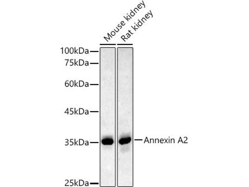 Annexin A2 (ANXA2), also known as lipocortin II or calpactin-1 heavy chain, is a 36 kDa member of the annexin superfamily that binds phospholipids and other proteins in a calcium-dependent manner via annexin repeats. Annexin A2 contains four such repeats through which it mediates protein-protein and protein-lipid interactions. It forms a constitutive heterotetramer with S100A10, acting as a bridge between the actin cytoskeleton, plasma membrane, and endocytotic vesicle machinery. Originally identified as a protein inhibitor of phospholipase A2, annexin A2 has subsequently been shown to interact with an array of protein and non-protein partners, including F-actin, spectrin, SNARE complexes, RNA, and virus particles. Annexin A2 has also been shown to have receptor-like activity and is detected on the surface of macrophages and vascular endothelial cells where it mediates macrophage activation and Factor Xa signaling, respectively. Upregulation of annexin A2 at the cell surface is thought to be modulated by phosphorylation at Tyr23 by Src. Interestingly, phosphorylation at Tyr23 has recently been shown to be required for cell surface expression of annexin A2 where it mediates motility, invasiveness, and overall metastatic potential of certain pancreatic cancer cells. Annexin A2 has also been shown to be heavily phosphorylated on serine residues in response to PKC activation via a pleiotropic mechanism. For a complete list of curated phosphorylation sites on annexin A2, please see PhosphoSitePlus® at www.phosphosite.org. Synonyms: ANX2, ANX2L4, CAL1H, LIP2, LPC2, LPC2D, P36, PAP-IV