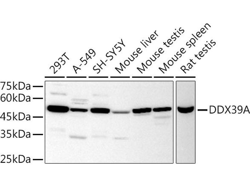 - This gene encodes a member of the DEAD box protein family. These proteins are characterized by the conserved motif Asp-Glu-Ala-Asp (DEAD) and are putative RNA helicases. They are implicated in a number of cellular processes involving alteration of RNA secondary structure, such as translation initiation, nuclear and mitochondrial splicing, and ribosome and spliceosome assembly. Based on their distribution patterns, some members of the DEAD box protein family are believed to be involved in embryogenesis, spermatogenesis, and cellular growth and division. This gene is thought to play a role in the prognosis of patients with gastrointestinal stromal tumors. A pseudogene of this gene is present on chromosome 13. Alternate splicing results in multiple transcript variants. Additional alternatively spliced transcript variants of this gene have been described, but their full-length nature is not known.,DDX39A,BAT1,BAT1L,DDX39,DDXL,URH49,Epigenetics & Nuclear Signaling,DDX39A