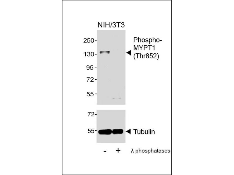 This Phospho-MYPT1 (Thr852) antibody is generated from a rabbit immunized with a KLH conjugated synthetic peptide between 824-857 amino acids from the human MYPT1.