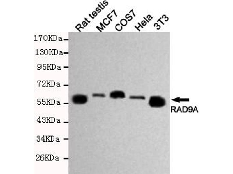 Component of the 9-1-1 cell-cycle checkpoint response complex that plays a major role in DNA repair. The 9-1-1 complex is recruited to DNA lesion upon damage by the RAD17-replication factor C (RFC) clamp loader complex. Acts then as a sliding clamp platform on DNA for several proteins involved in long-patch base excision repair (LP-BER). The 9-1-1 complex stimulates DNA polymerase beta (POLB) activity by increasing its affinity for the 3'-OH end of the primer-template and stabilizes POLB to those sites where LP-BER proceeds, endonuclease FEN1 cleavage activity on substrates with double, nick, or gap flaps of distinct sequences and lengths, and DNA ligase I (LIG1) on long-patch base excision repair substrates. The 9-1-1 complex is necessary for the recruitment of RHNO1 to sites of double-stranded breaks (DSB) occurring during the S phase. RAD9A possesses 3'->5' double stranded DNA exonuclease activity. Its phosphorylation by PRKCD may be required for the formation of the 9-1-1 complex.
