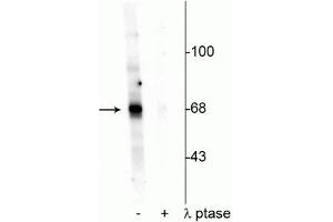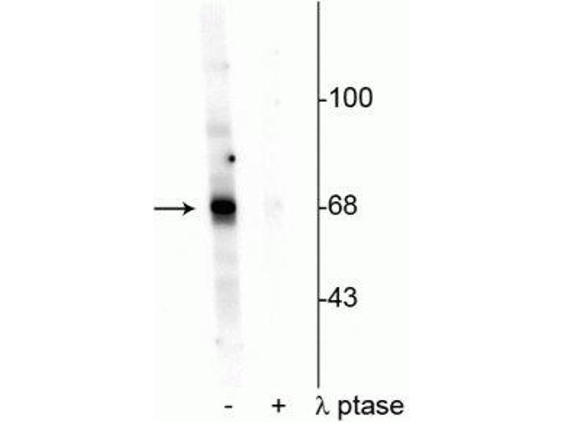 - Specific for endogenous levels of the ~68 kDa AKT protein phosphorylated at Thr342. Immunolabeling is completely eliminated with λ-phosphatase treatment. It has been reported that this antibody may also recognize some level of phosphorylated S6K as there is 67 % homology with the sequence used as antigen.
