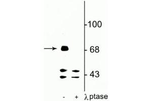 - Specific for endogenous levels of the ~71 kDa FMRP protein phosphorylated at Ser499. Immunolabeling is completely eliminated by treatment with λ-phosphatase.